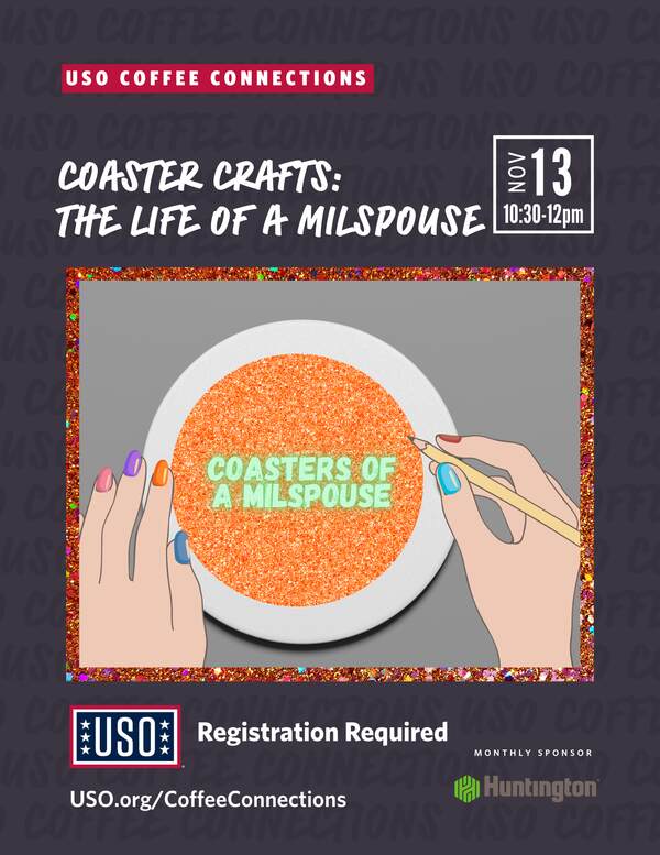 Join us for a creative and connection-filled morning celebrating the many “eras” of military spouse life. Enjoy coffee, light refreshments, and meaningful conversation while painting coasters that represent your unique journey as a milspouse. Whether you’re new to the community or a seasoned spouse, this is your time to relax, connect, and reflect on the experiences that have shaped your story.