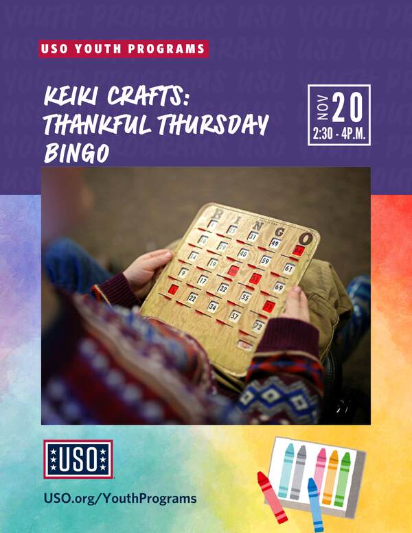 Double the fun at the USO! Join us for Keiki Crafts & Bingo — an afternoon of creativity, laughter, and giveaways. Kids can help create our Thanksgiving Banner and then stick around for a few rounds of Bingo with the whole family. November 20th | 2:30–4:00 pm