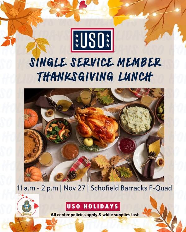 We welcome our single service members to join us for our annual Thanksgiving Lunch located in F-Quad on Schofield Barracks. 11 a.m - 2 p.m