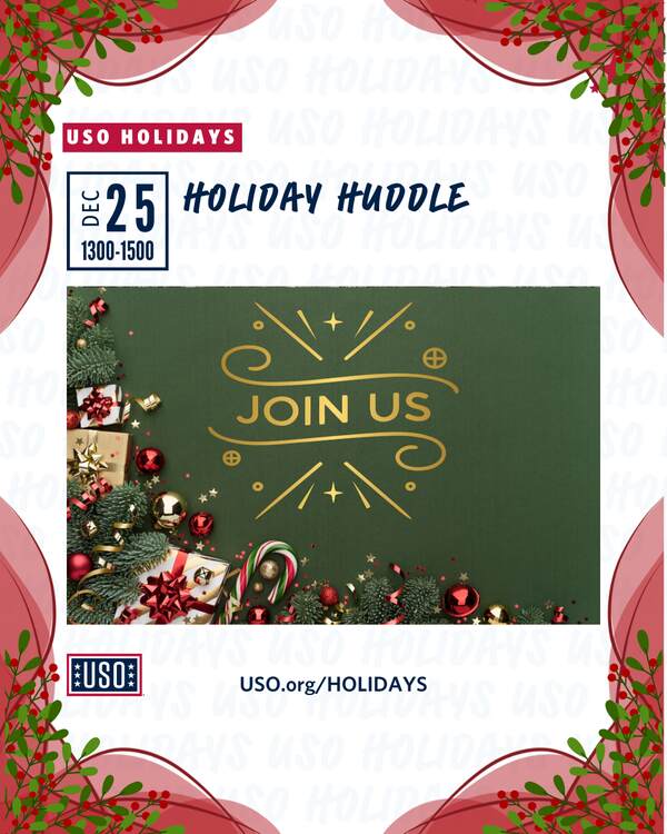 Join us for our USO “Holiday Huddle,” a warm and festive gathering created especially for single service members. Come enjoy comforting holiday flavors, seasonal treats, and a welcoming space to relax and connect during this special time of year. Whether you’re looking for a cheerful break, a bit of home-inspired comfort, or just good company, our Holiday Huddle is the perfect place to unwind and share in the spirit of the season.🎄