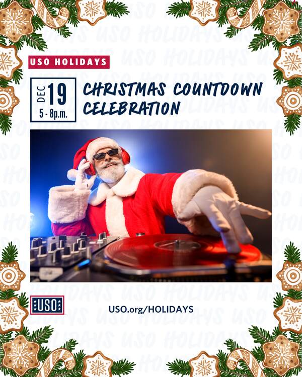 Join us for our USO Christmas Countdown Celebration! Families, single service members—everyone is invited to kick off the season with festive fun. Enjoy holiday games, a cheerful photo backdrop, an ornament-making station, and of course, hot cocoa and cookies to keep things cozy. Come dressed in your favorite holiday attire—PJs, ugly sweaters, or anything festive—because we want to see your best seasonal style. Bring the joy, bring the laughs, and help us count down to the holidays in true USO spirit!