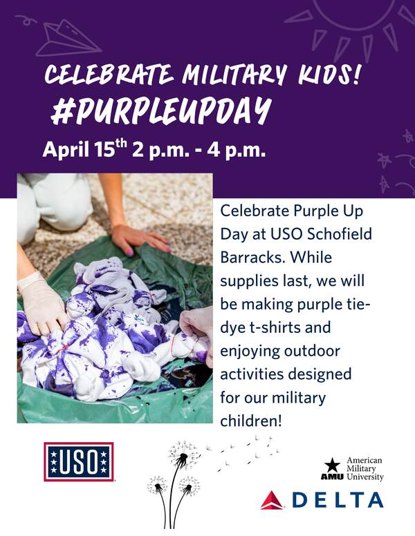 Celebrate Purple Up Day at USO Schofield Barracks. While supplies last, we will be making purple tie-dye t-shirts and enjoying outdoor activities designed for our military children!